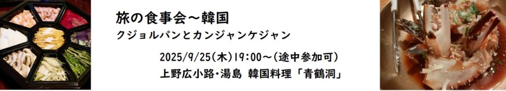 韓国料理は、人数が多いとそれだけ多くの種類の料理を食べれます。旅人会の食事会ではコアな旅の情報の交換ができます。夏・9月の連休の旅の話をしながら楽しみましょう。